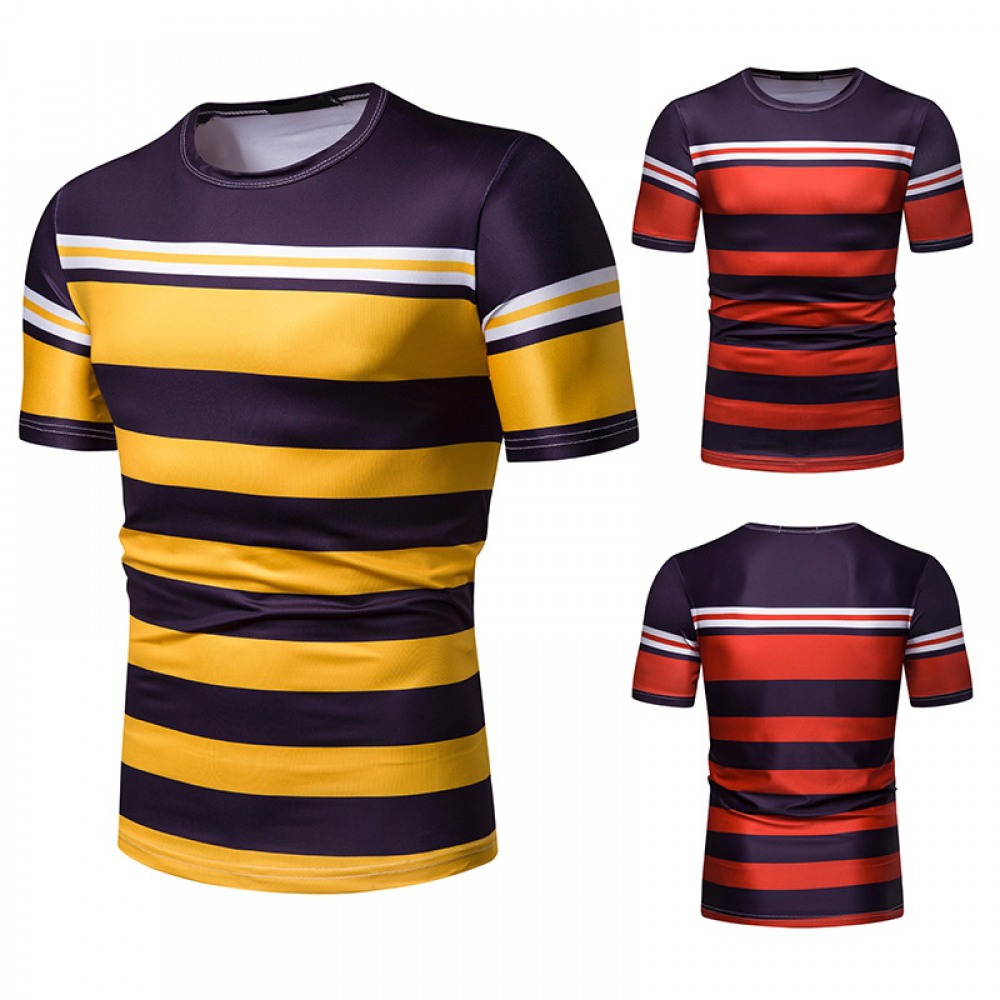 New Summer Men's Short-Sleeved T-Shirt Mens Contrast Striped Slim-Fit Casual T-Shirt